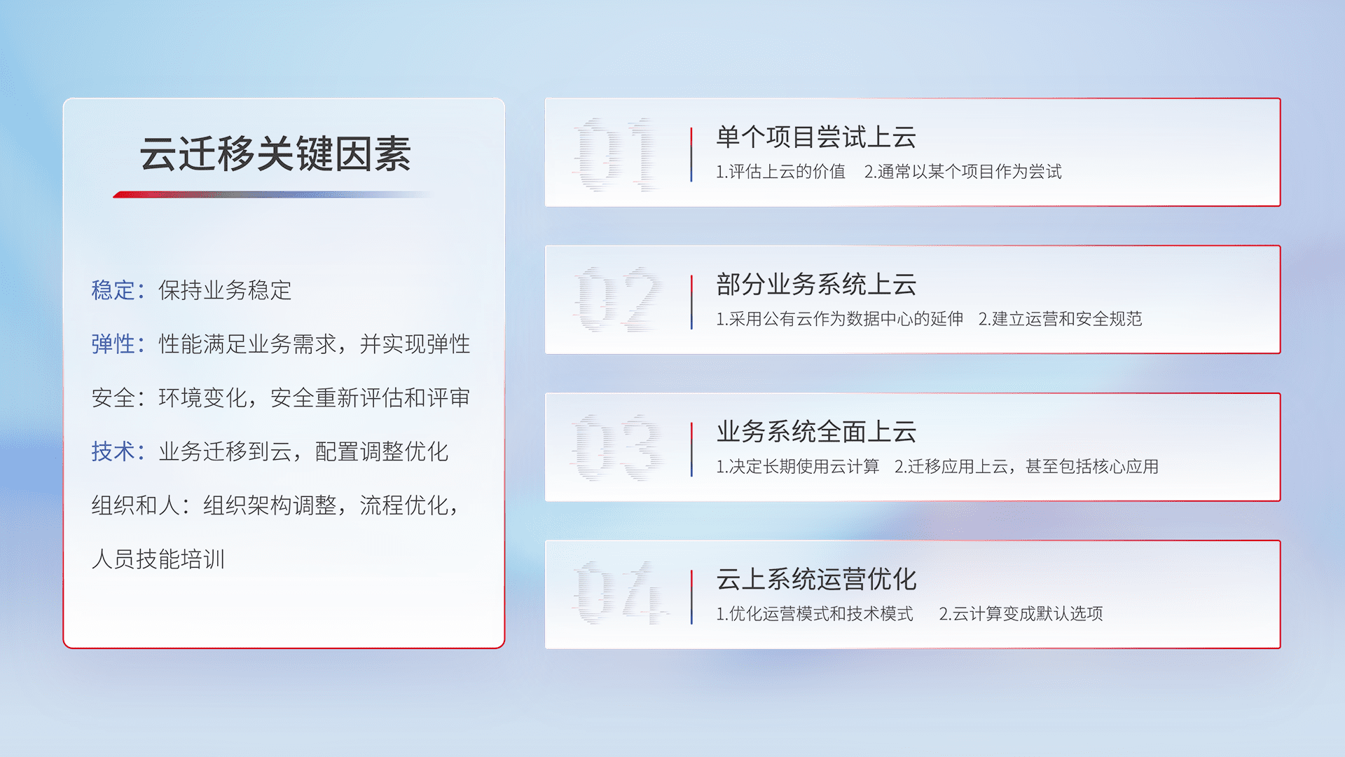 结合实际业务,,,从规划设计、、、云平台选型、、、、云原生改造、、、、数据迁移、、集成交付,,,,迁移全过程为客户识别最佳上云路径,,,,做好风险识别管理,,,设计网络架构、、身份权限、、、、安全审计合规、、操作审计、、、、日志审计、、、、监控告警策略、、多站点容灾设计等,,,对云上基础设施进行整体规划,,提升IT治理水平,,,以满足弹性、、、、高可用、、高性能的需求。。。。